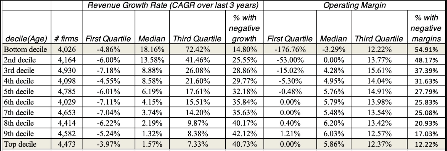 As you can see, the youngest companies have much higher revenue growth and more negative operating margins than older companies.