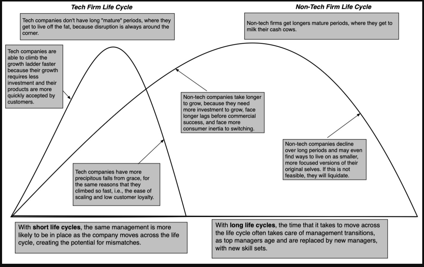 Tech companies age in dog years, and the consequences for how we manage, value and invest in them are profound. In fact, I would argue that the lessons that we teach in business school and the processes that we use in analysis need adaptation for compressed life cycle companies, and while I don’t have all the answers, the discussion about changing practices is a healthy one.