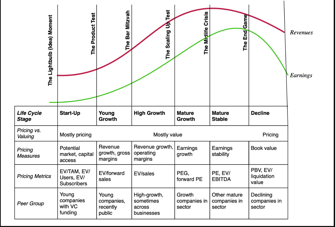 The draw of pricing is strong even for those who claim to be believers in value, and pricing in its simplest form requires a standardized price (a multiple like price earnings or enterprise value to EBITDA) and a peer group. While the pricing process is the same for all companies, the pricing metrics you use and the peer groups that you compare them to will shift as companies age: