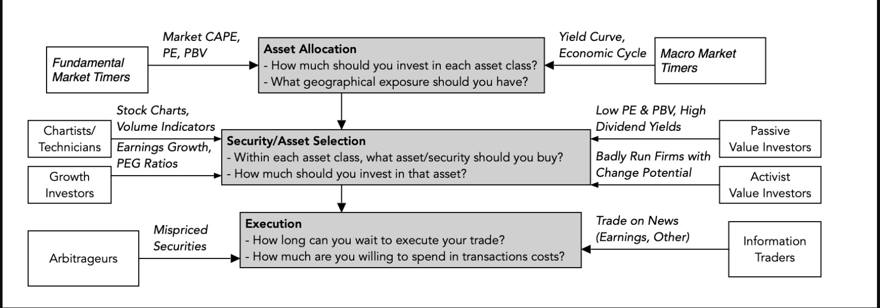 In my class (and book) on investment philosophies, I start by noting that every investment philosophy is rooted in a belief about markets making (and correcting) mistakes, and that there is no one best philosophy for all investors. I use the investment process, starting with asset allocation, moving to stock/asset selection and ending with execution to show the range of views that investors bring to the game: