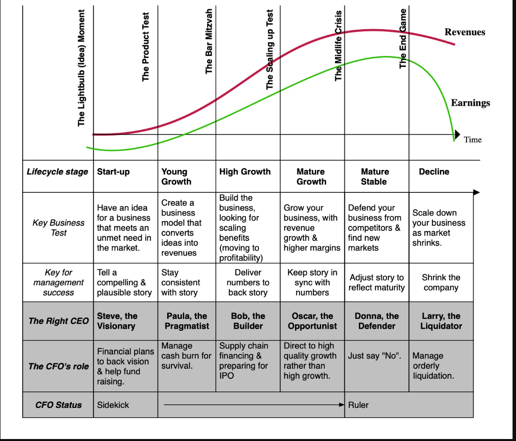Early in the life cycle, you want a visionary at the top, since you have to get investors, employees and potential customers to buy into that vision. To turn the vision into products and services, though, you need a pragmatist, willing to accept compromises. As the focus shifts to business models, it is the business-building skills that make for a great CEO, allowing for scaling up and success. As a scaled-up business, the skill sets change again, with opportunism becoming the key quality, allowing the company to find new markets to grow in. In maturity, where playing defense becomes central, you want a top manager who can guard a company’s competitive advantages fiercely. Finally, in decline, you want CEOs, unencumbered by ego or the desire to build empires, who are willing to preside over a shrinking business, with divestitures and cash returns high on the to-do list.