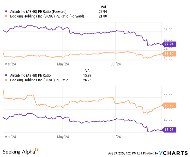 Airbnb’s forward price-to-earnings (P/E) ratio is still higher than Booking, even though the current P/E is lower: