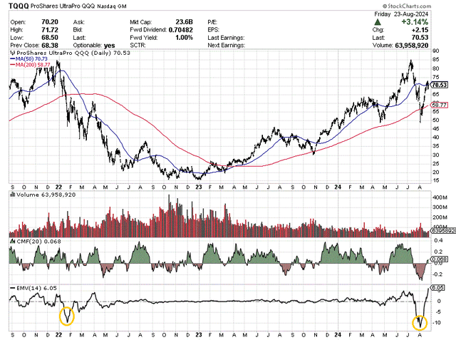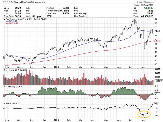I have drawn a 12-month chart below of daily price and volume trading activity. I have circled in gold the crazy-bad, all-time low readings in late July and early August for the 14-day EMV calculation. In addition, the 20-day Chaikin Money Flow indicator has corroborated the concept of sizable capital moving out of TQQQ.