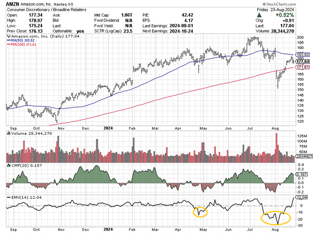 StockCharts.com – Amazon, 1 Year of Daily Price & Volume Changes, Author Reference Points
