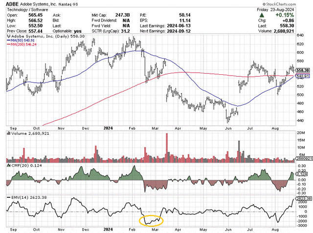 StockCharts.com – Adobe, 1 Year of Daily Price & Volume Changes, Author Reference Point