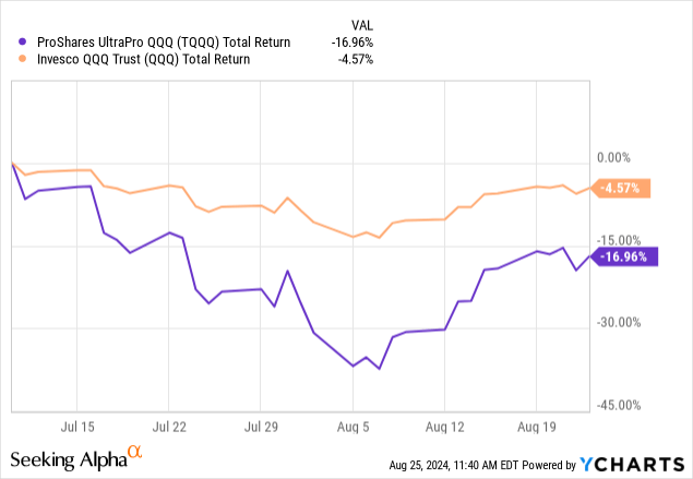 YCharts – TQQQ vs. QQQ, Total Returns, Since July 10th, 2024
