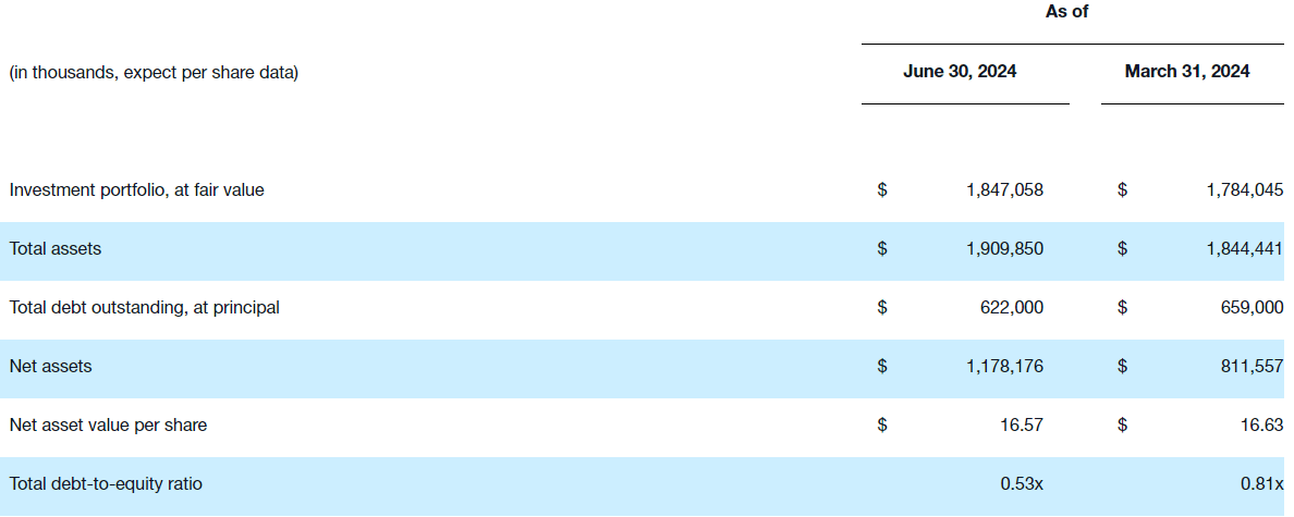 As of the end of June, the NAV was $16.51, down $.06 from the prior quarter. Their Revolving Funding Facility saw a cost reduction of 25-50bps depending on the quality of the loans used as collateral. For the quarter, new private credit investment commitments of $141.8 million, fundings of $136.2 million and sales and repayments of $40.5 million, thus resulting in a net funded private credit portfolio increase of $95.7 million. While NII was flat, the EPS was down $.15 due to a net realized loss this quarter versus a gain the prior quarter. QoQ financial data were:
