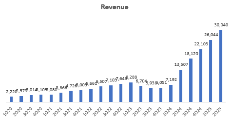 Nvidia’s Q2 FY25 printed $30 billion in revenues (122.4% YoY, 15.3% QoQ). Consistent with its track record, it also beat consensus estimates by 4.5%: