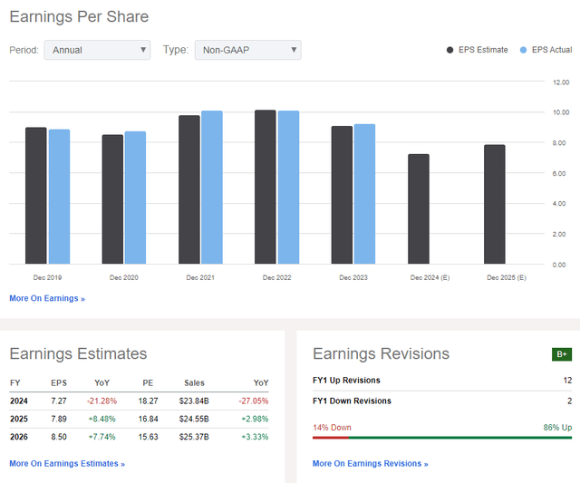 On the earnings outlook, analysts now expect $7.27 of operating EPS this year, with growth returning to the out year. By 2026, non-GAAP per-share profits could reach $8.50, cementing mid-to-high single-digit EPS growth in the quarters ahead. Revenue growth should be somewhat stable post the Solventum spinoff, and the sellside has turned more upbeat following the strong Q2 report in July.