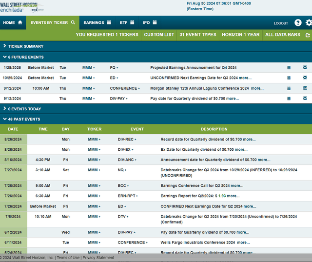Looking ahead, corporate event data provided by Wall Street Horizon show an unconfirmed Q3 2024 earnings date of Tuesday, October 29 before market open. Before that, 3M’s management team is slated to present at the Morgan Stanley 12th Annual Laguna Conference 2024 starting on September 12.