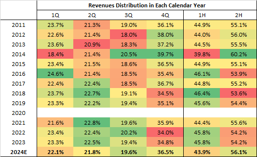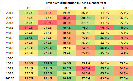 That answer did not seem convincing enough to me for the level of improvement required in the second half, so let’s try to see, based on the company’s seasonality and from an historical perspective how realistic is that second half outlook.