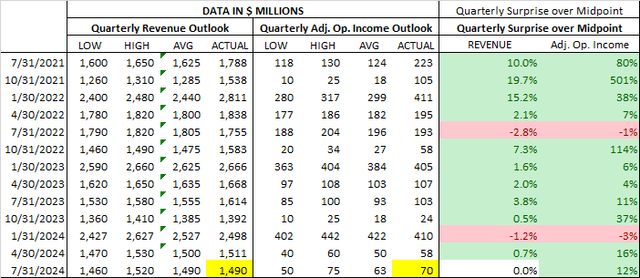 Lately the company has been able to overdeliver in terms of Adjusted Operating Income and to a lower extent in term of revenues, but those surprises have become smaller as we got away from the post pandemic consumption boom years. So, I would assume zero surprise for the 2nd quarter in terms of revenues and a mild positive one in terms of adjusted operating income (The figures marked in yellow in the next table).