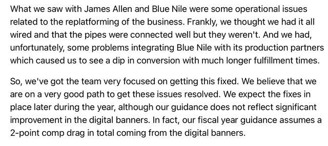 If you want to understand this situation in further detail and compare the structure of their guidance with the one provided by SIG, I put two articles (first & second) on the name. Those describe management’s outlook in detail, disaggregating their traditional operations from the confounding effects of a recent acquisition and using the same type of charts that I used for Signet in this article.