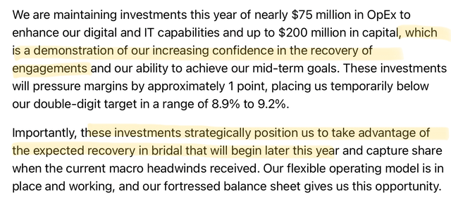 In the end, the objective of this article is to be informative as all the data that I used for my analysis is shown in the charts, links and tables included here, and the reader can reach his or her own conclusion based on the information. Maybe some of you think that the integration issues around their digital banners are a sufficient explanation for the unusual pattern implied in their guidance, or that the bridal category can experience a sufficiently big second half turnaround, and that might end up being correct.