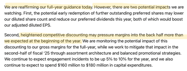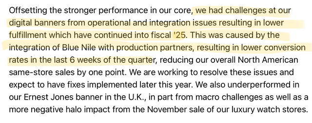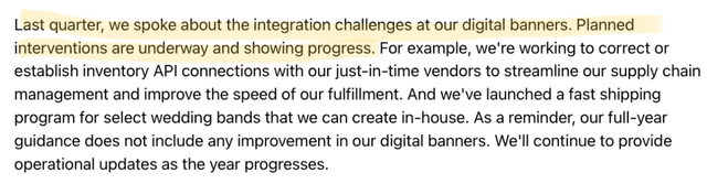 Since the 4th quarter of 2023 (4Q Fiscal Year 2024) the company has been experiencing integration problems in their digital banners that have in their words “affected conversion”. The next two screenshots come from their 4Q Fiscal Year 2024 earnings call and the third one from the one of 1Q Fiscal Year 2025.