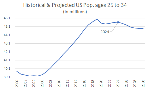 With that in mind, we can use the demographic historical statistics and projections by country provided by the OECD. These data sets are disaggregated in age brackets of 5 years each, so we are going to focus on the 25 to 29 and 30 to 34 age brackets to try to get a good indication of the TAM for the bridal category in the United States.