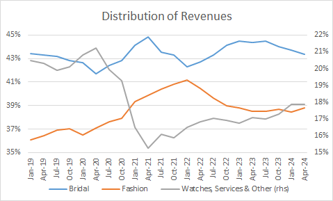 As you can see, the age bracket more likely to get married is expected to start slowly decreasing starting in 2024. And apart from that, it’s important to note that even with the underperformance of the bridal category in recent quarters, TTM revenue distribution seems to stand squarely in the middle of its historical range for this particular category.