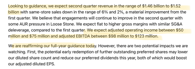 Apart from that, in terms of consumer demand, I don’t see any material change in what could be described as an overall weak US consumer, and while it’s true that management is expecting a recovery in the bridal category for the second half, they have been talking about this for more than year, so color me skeptical on that one.