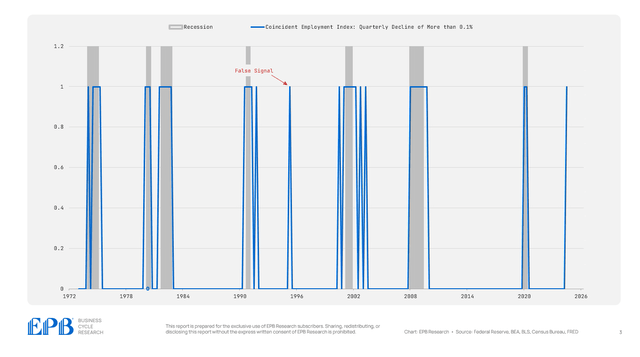 The chart below shows periods when the EPB Coincident Employment Index declined compared to two quarters ago. As the chart shows, no false signals exist dating back to 1973, and the signal overlaps closely with recessionary periods.