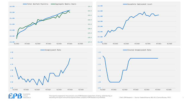 As the chart below shows, nonfarm payrolls and aggregate weekly hours continue to trend higher, while the household employment level peaked in November 2022. The unemployment rate is rising rapidly, and the insured unemployment rate is off the low point of the cycle but has held flat over the last several months.