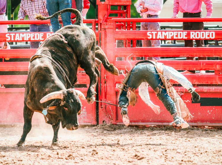 Rodeo cowboy thrown from bareback bull