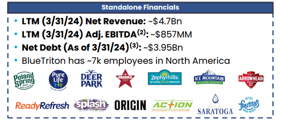This new suggested merger will bring about a company with net revenues of over $6.5B, and a leverage of only about 3x at close (likely one of the reasons for the disposals, if I’m allowed to speculate here), with an LTM EBITDA of over $1.5B at a margin of 23%. This would make it one of the most attractive businesses in this entire field, with an adjusted FCF of over $550M at this time, and a potential for synergies upwards of $200M. Both of these companies are over 70 years old, both of them have a lot of history, a lot of strong brands – and the addition of BlueTriton would bring to Primo’s portfolio the appeal of bottled water with the following brands and financials on a standalone basis.