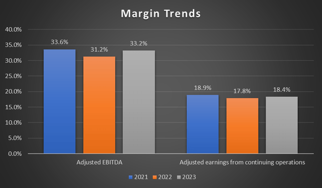 Despite a slight dip in adjusted EBITDA and earnings from continuing operations margins, the company’s margins have generally remained robust throughout the years. In FY22, adjusted EBITDA margins have contracted slightly to 31.2% before recovering in FY23, achieving 33.2%. Adjusted earnings also fell in FY22 to 17.8%, and AWI made an effort to regain margin strength in FY23, achieving 18.4% in adjusted earnings margin. The Mineral Fiber segment’s adjusted EBITDA margin has expanded by 180 bps, reaching 39.1% as a result of favorable AUV and strong contributions from its WAVE joint venture. The Architectural Specialties segment’s adjusted EBITDA margin has expanded by 230 bps, reaching 18.1% due to improved operating performance in that year.