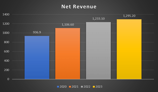 Over the years, AWI has demonstrated robust and consistent revenue growth. Its upward trend in net revenue is consistent, hitting a record-setting $1.29 billion. In FY23, the company reported net revenue of $1.29 billion, indicating a year-over-year growth of ~5%, primarily due to an improved average unit value [AUV] of $43 million and a stronger sales volume of $19 million. Acquisitions of BOK Modern and GC Products primarily drive net sales growth in the Architectural Specialties segment. In FY22, its net sales have grown significantly by 11.3% year-over-year. Favorable AUV drives the mineral fiber segment’s sales, but lower sales volume from reduced inventory levels in the first half of the year and weaker demand in the latter half offset this growth. Growth in the Architectural Specialties segment was broad-based, with sales increasing across various product categories, contributing significantly to the overall segment revenue increase.