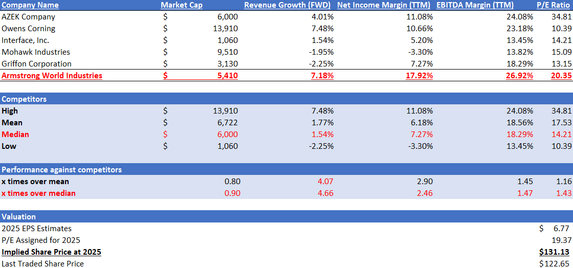 Currently, AWI’s forward non-GAAP P/E ratio is 20.35x, while peers’ median is 14.21x. Given AWI’s strong outperformance, I argue that it is fair for AWI to be trading at a premium. AWI’s 5-year average forward P/E is 19.37x. To remain conservative in my valuation approach, I will be adjusting my 2025 target P/E for AWI down towards its 5-year average.