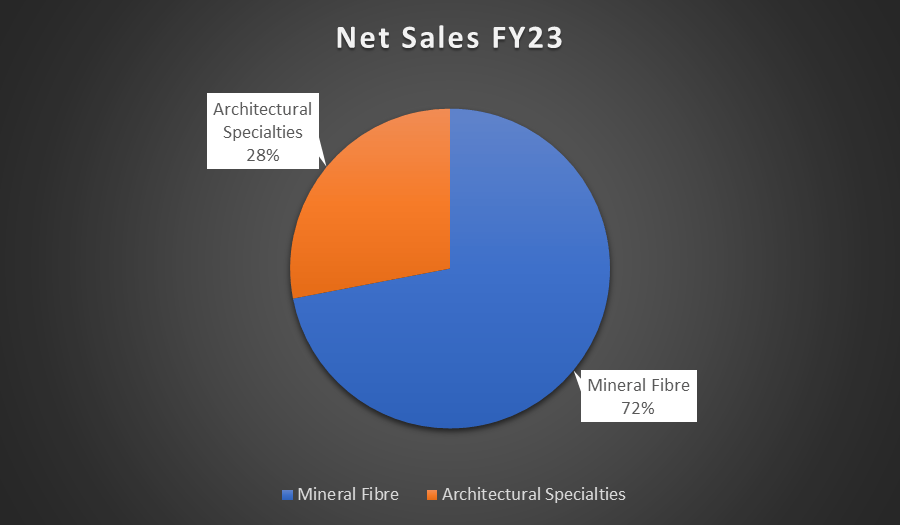AWI is a market leader in innovation, manufacturing, and design of commercial and residential ceiling and wall solutions in the Americas. They produce their products crafted from a wide variety of materials, such as glass-reinforced-gypsum, wood, felt, metal, mineral fiber, and fiberglass wool. AWI’s joint venture with Worthington Enterprises, Worthington Armstrong Venture [WAVE], manufactures ceiling suspension system products. We can segregate its business into two segments: Mineral Fiber and Architectural Specialties. Mineral Fiber accounts for the majority of the sales, manufacturing suspended mineral fiber and soft fiber ceiling systems. They are mostly sold to resale distributors, contractors, wholesale, and retailers. This segment also accounts for WAVE’s performance, which manufactures suspension systems and ceiling component products. The Architectural Specialties segments account for the remaining sales. This segment manufactures, designs, and sources ceilings, walls, and facades for commercial uses.