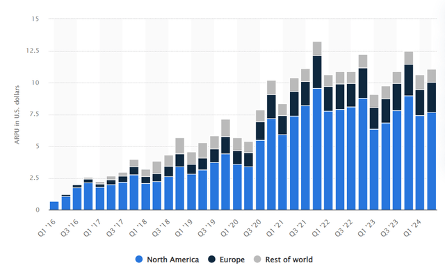 Snap only produced $2.86 in ARPU during Q2’24 per DAU. The RoW ARPU of $1.02 pulls down the total ARPU with a huge concentration of users in India.
