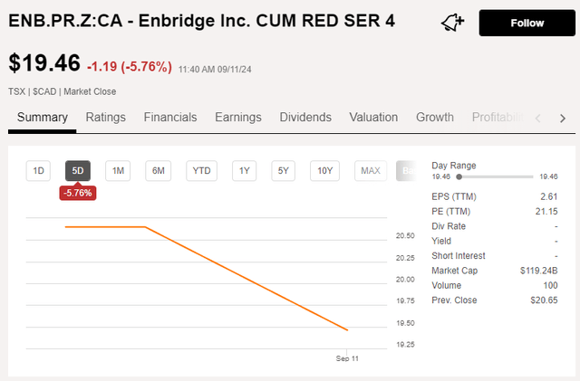 In this article I will focus on the newly issued Series 4 preferred shares of Enbridge (NYSE:ENB) which started trading just a few days ago. From a fundamental perspective, nothing has changed since my previous article was published in August, and I’d like to refer you to that article to read up on the dividend coverage ratio and asset coverage ratio of Enbridge’s preferred stock.