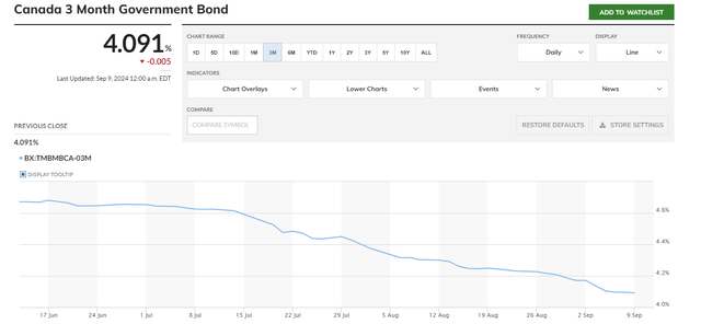 Sounds great, but keep in mind the preferred dividend will fluctuate every quarter. And the three-month government bond yield has been steadily decreasing in the past few months (the Bank of Canada has been walking down its benchmark interest rate, and this obviously had a negative impact on the short-term interest rates on the financial market). As you can see below, the three-month yield has lost about 60 bps in the past three months.