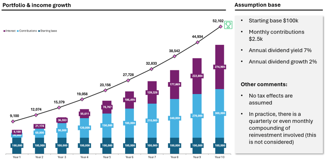 One of the most critical factors that drive these results is the starting dividend yield and the dividend growth aspect. In first year by investing in 7% yielding asset, assuming an annual 2% dividend growth, the yield on cost by year 10 lands at 8.4%, which adds a nice benefit to the overall income production. Yet, the 7% yield factor plays obviously much greater role.