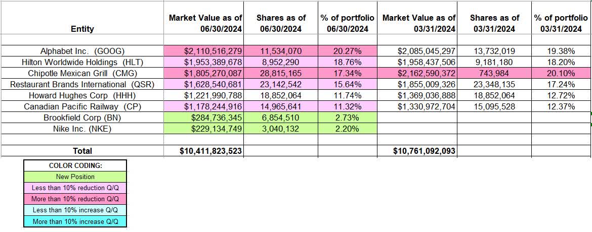 The spreadsheet below highlights changes to Pershing Square’s 13F stock holdings in Q2 2024:
