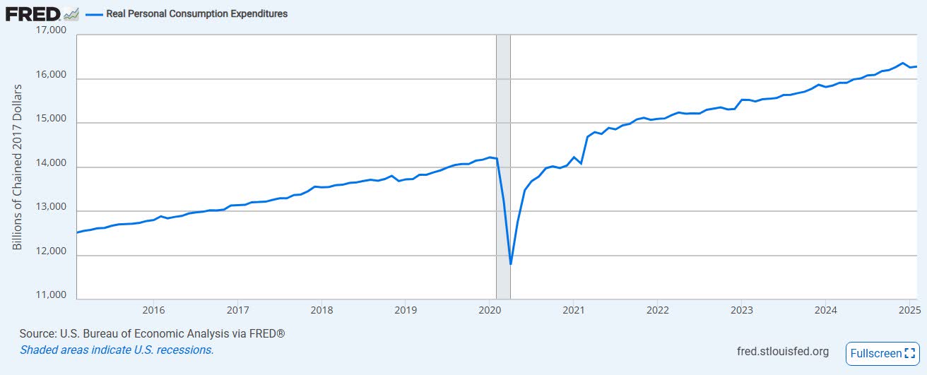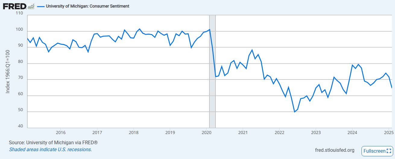 Consumers have remained relatively depressed ever since the COVID pandemic, with actual consumer spending looking rather resilient. The latest data suggests a slight bump in the road, but no major trend change at this point. It is important to listen to how consumers feel, as it can indicate future weakness, but this has not been a very reliable signal over the past few years.
