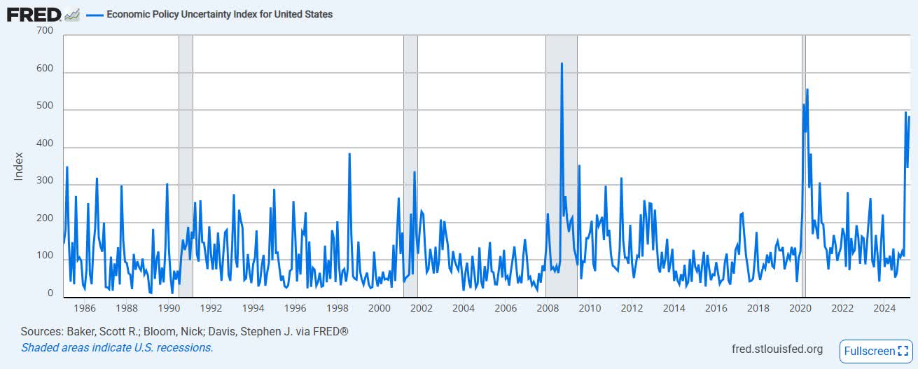 Economic policy uncertainty is near levels seen during COVID and during the Great Recession. This is surprising, as economic panic felt more palpable out on Main Street during those two prior peaks. While the current environment has raised a few eyebrows, we think that the uncertainty brought upon by tariffs and DOGE can be resolved rather quickly, for better or worse. We have no illusions that tariffs are good for consumers, but we do hope for more straightforward messaging and policy in due time.