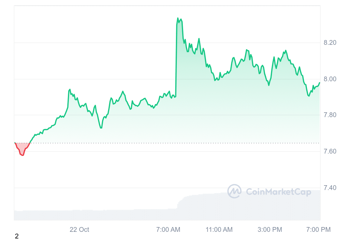 Upbit, South Korea’s largest cryptocurrency exchange, announced the listing of UNI on its KRW and USDT markets. Trading is set to start on October 22 at 15:00 (UTC+8). UNI was already available for trading in the UNI/BTC pair. Following this news, the token experienced a 5.2% increase, reaching $8.31. Its fully diluted valuation (FDV) is now $8.31 billion.