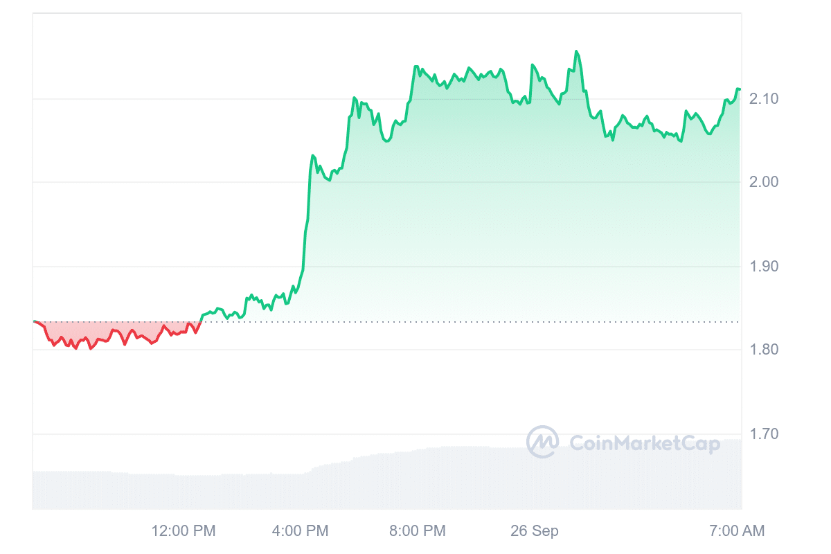 Worldcoin (WLD) has seen consistent growth, rising for three consecutive days following the expansion of its services to additional countries. The token recently tested the $2 resistance level, marking its highest point since early August and reflecting a 54% increase from its lowest level that month.