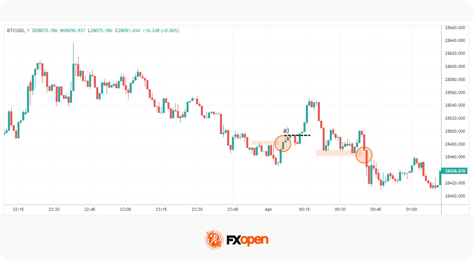 To start, we need to identify a support or resistance level. A common way is to look for relatively equal highs or lows forming, like in the chart above. When the level is broken with a strong impulsive move, traders may enter on the close of the breakout candle. However, if the move isn’t particularly strong, like at a), they could wait for a pullback. Traders can also place a stop order to enter as the pullback itself breaks out, as marked by the dotted lines.