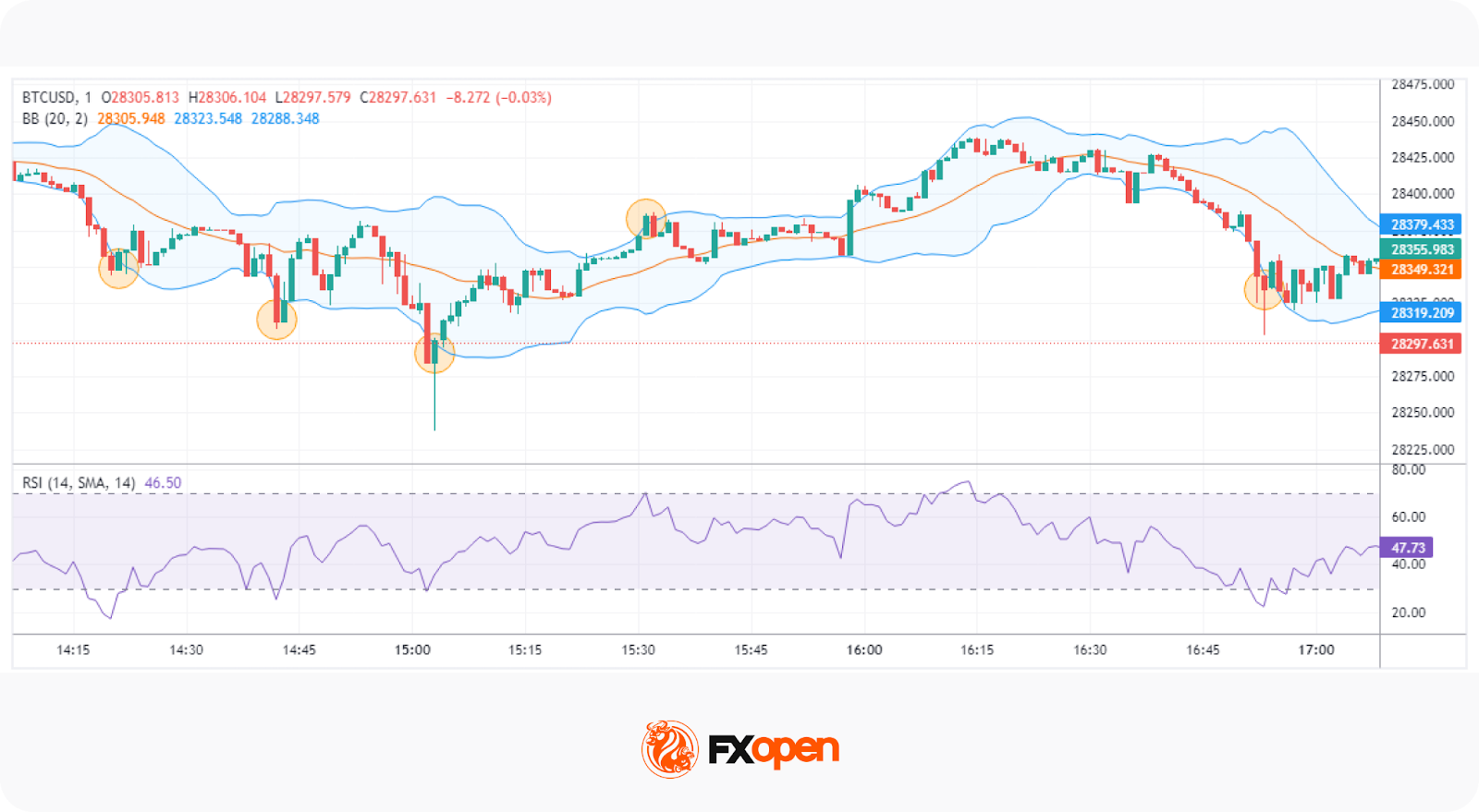 As for exit conditions, some scalpers may prefer to place a take-profit order at the midpoint of the Bollinger Bands or the opposing band. Others may close their trades when RSI crosses above or below 50, depending on the direction of trade. In terms of stop losses, they might be placed above or below a nearby area of support or resistance. Alternatively, traders choose a fixed distance for each trade.
