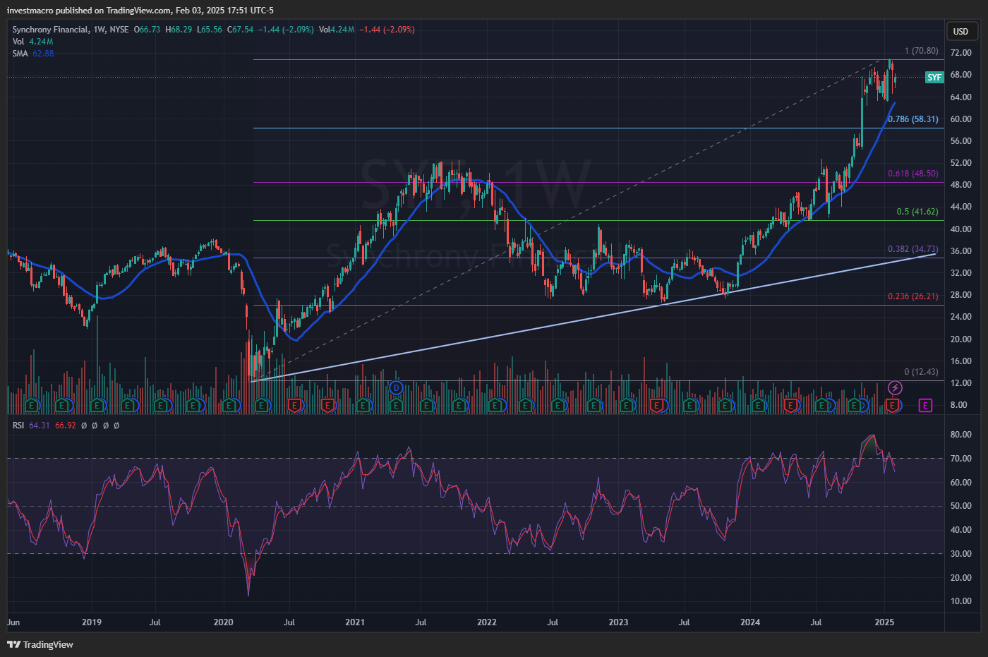 SYF missed their earnings-per-share expectations this quarter after beating expectations in the previous three quarters. Synchrony’s dividend is currently at approximately 1.50 percent and has a payout ratio of around just 12 percent at time of writing. The stock price has outperformed the Financial Sector benchmark over the past 52 weeks with a whopping 74.13 percent gain compared to the 31.35 percent benchmark return. SYF is currently trading near the top of its range with a recent overbought level on the weekly relative strength index (RSI).