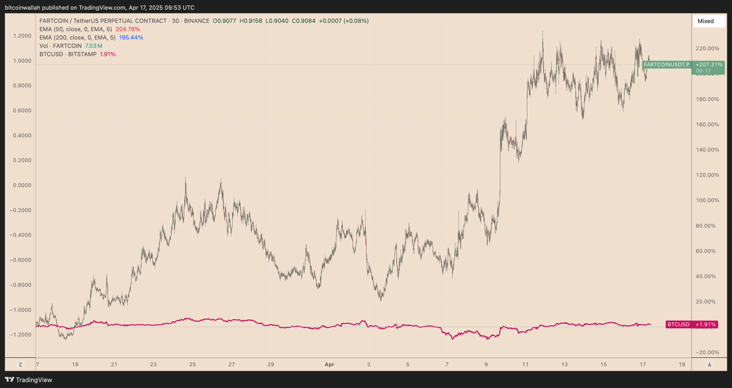 Fartcoin (FARTCOIN), a Solana-based memecoin launched in October 2024, has soared over 370% from its yearly low, outperforming Bitcoin (BTC ($84,583.00)) even as global trade tensions weigh on broader risk assets.