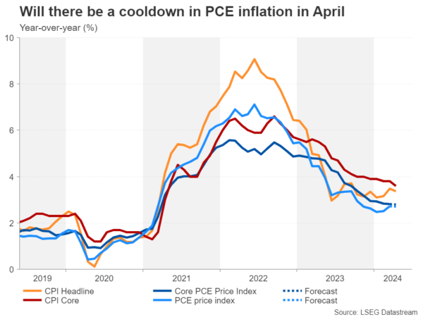 Aside from PCE inflation, personal income and spending figures will also be watched in the same report. Personal income is forecast to have risen by 0.3% m/m in April, down from 0.5% in the prior month. More importantly, consumer spending is expected to have slowed, growing by just 0.3% m/m versus 0.8% in March.