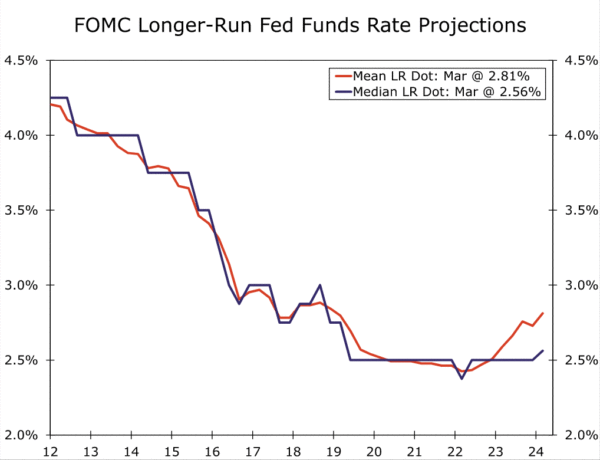 We will also be keeping a close eye on the “longer-run” (LR) fed funds rate projections. The longer-run projections represent each participant’s assessment of the fed funds rate that would best satisfy maximum employment and price stability over the longer run. In other words, the LR fed funds rate projections are the participants’ views on the neutral policy rate. The median longer-run dot steadily fell for most of the 2010s, eventually settling at 2.5% in 2019. The median LR dot essentially did not move between June 2019 and December 2023. But starting in 2023, the mean LR dot began to climb as a handful of outliers started raising their longer-run projections, and the median ticked ever so slightly higher in the March SEP (Figure 5).