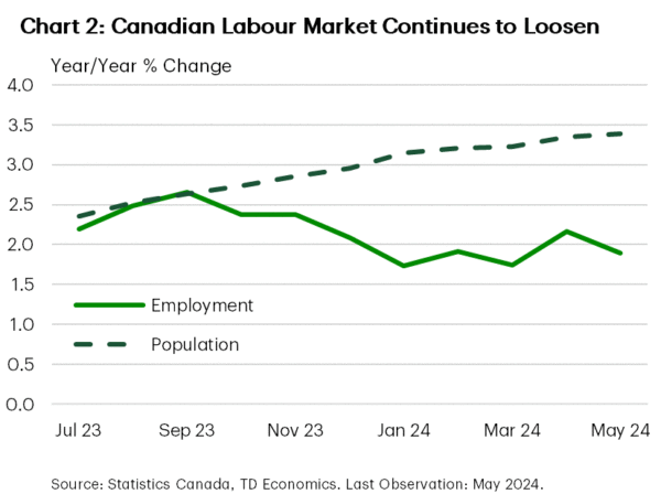 The Bank of Canada (BoC) cut its policy rate by 25 basis points this week (to 4.75%), recognizing the easing in inflationary pressures that we have been harping on for all of 2024 (Chart 1). This was welcomed news for an economy that has been stuck in a rut for the better part of the last two years. Canadian employment confirmed this, as the unemployment rate rose to 6.2% (from 6.1%), even though jobs rose 27k in May.