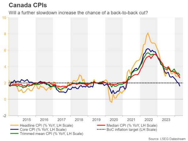 Canada’s CPI numbers are also on next week’s agenda. They are due out on Tuesday. Earlier this month, the BoC became the second central bank in the G10 group to cut interest rates by 25bps, with Governor Macklem signaling that it would be “reasonable to expect further cuts” if inflation continues to cool.
