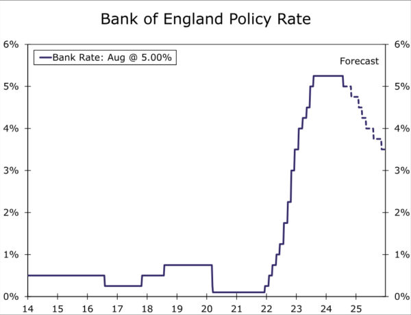 Overall, we view today’s announcement as consistent with our view the Bank of England will take an initially cautious approach to monetary easing. Stronger near-term economic growth, a likely rebound in near-term inflation and the possibility of upside surprises, and the BoE’s careful guidance all point to a gradual pace of rate cuts. We expect only one more policy rate cut this year, of 25 bps at the November monetary policy announcement. As inflation recedes next year and given the potential for a medium-term inflation undershoot, we do expect a faster pace of easing in 2025. We forecast a cumulative 125 bps of rate cuts next year which would see the policy rate end 2025 at 3.50% and, moreover, we believe the balance of risks is tilted toward faster rate cuts than slower rate cuts in 2025.