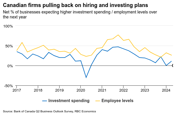 Overall, forward-looking indicators are showing little signs of recovery in hiring demand. Job openings in Canada have continued to decline in recent months, and businesses surveyed in the Q2 Bank of Canada outlook survey again reported lacklustre intentions to hire and invest over the next year.