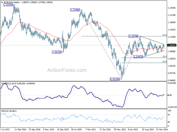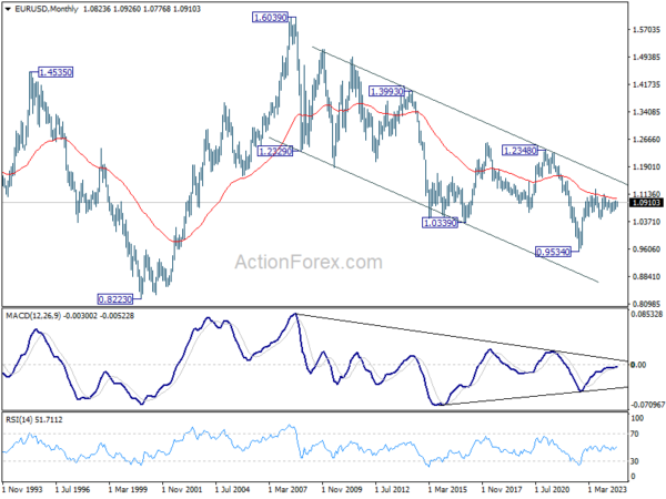 In the long term picture, a long term bottom is in place at 0.9534 (2022 low). Sustained break of 55 M EMA (now at 1.1011) will raise the chance of long term reversal. But even in this case, firm break of 1.2348 structural resistance is needed to confirm. Rejection by 55 M EMA will maintain bearishness for extend the down trend from 1.6039 (2008 high) through 0.9534 at a later stage.
